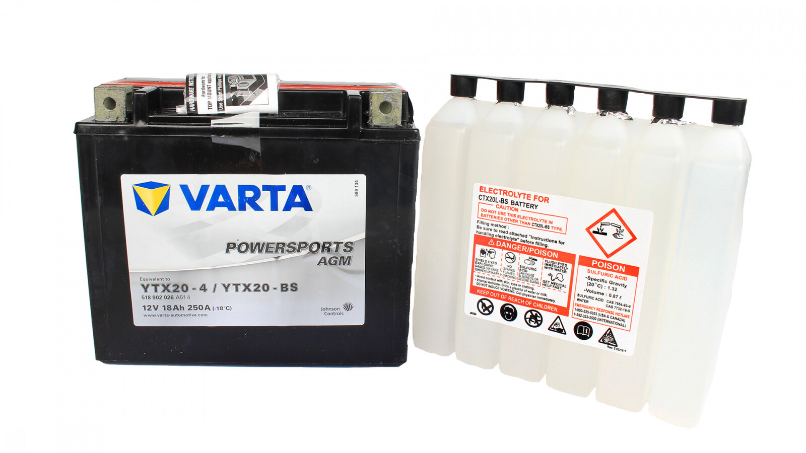 Аккумулятор для мотоцикла и скутера VARTA POWERSPORTS AGM 18 А/ч 250 А прям. пол. с/зар. с эл. YTX20-4, YTX20-BS (177х88х156) 518902