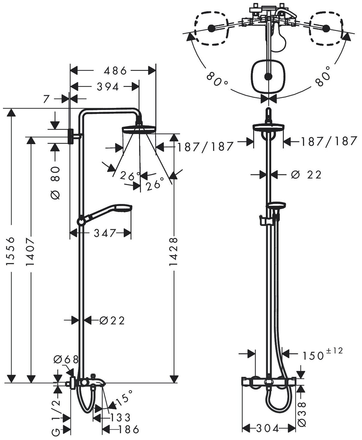 | Дополнительная информация | покрытие белый/хром; высота стойки для душа: 1556 мм; диаметр душевой лейки: 110 мм; длина верхнего душа: 180 мм; ширина верхнего душа: 180 мм |