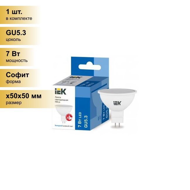 10шт/уп. Лампа LED Спот 7Вт 230B MR16 GU5.3 630Лм 6500К Свет Холодный белый арт. LLE-MR16-7-230-65-GU5 IEK, уп. 10шт