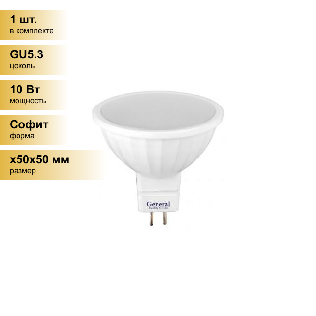 General, Лампа светодиодная 12 вольт, Комплект из 10 шт., 10 Вт, Цоколь GU5.3, 4500К, Форма лампы Круг