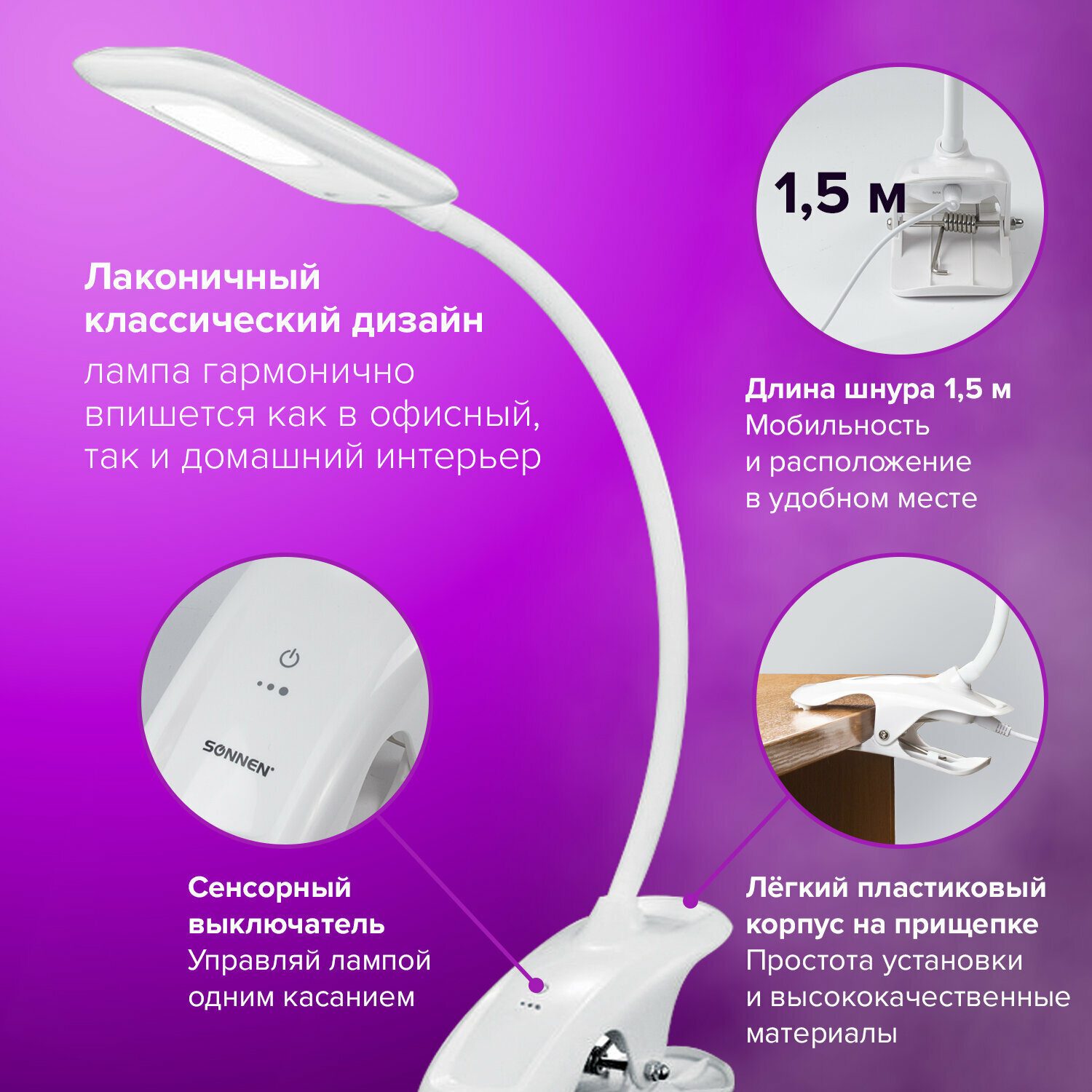 Настольная лампа-светильник SONNEN BR-819C, на прищепке, светодиодная, 8 Вт, белый, 236667 Комплект - 1 шт .