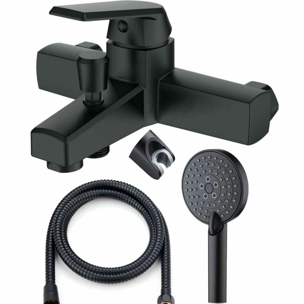 Однозахватный полимерный смеситель для ванны и душа с фиксированным изливом и душевым набором OL02300b черный матовый