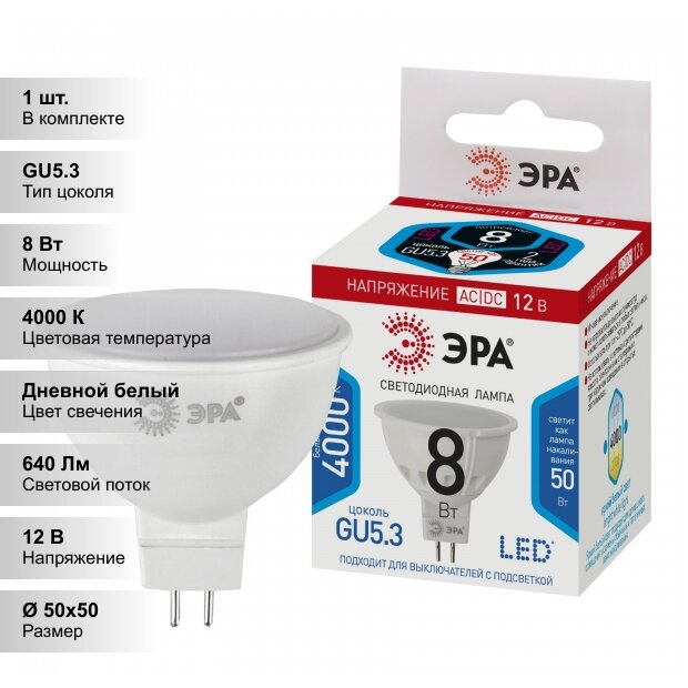 Эра Б0049094 Светодиодная лампа LED MR16-8W-12V-840-GU5.3 8 Вт софит нейтральный белый свет