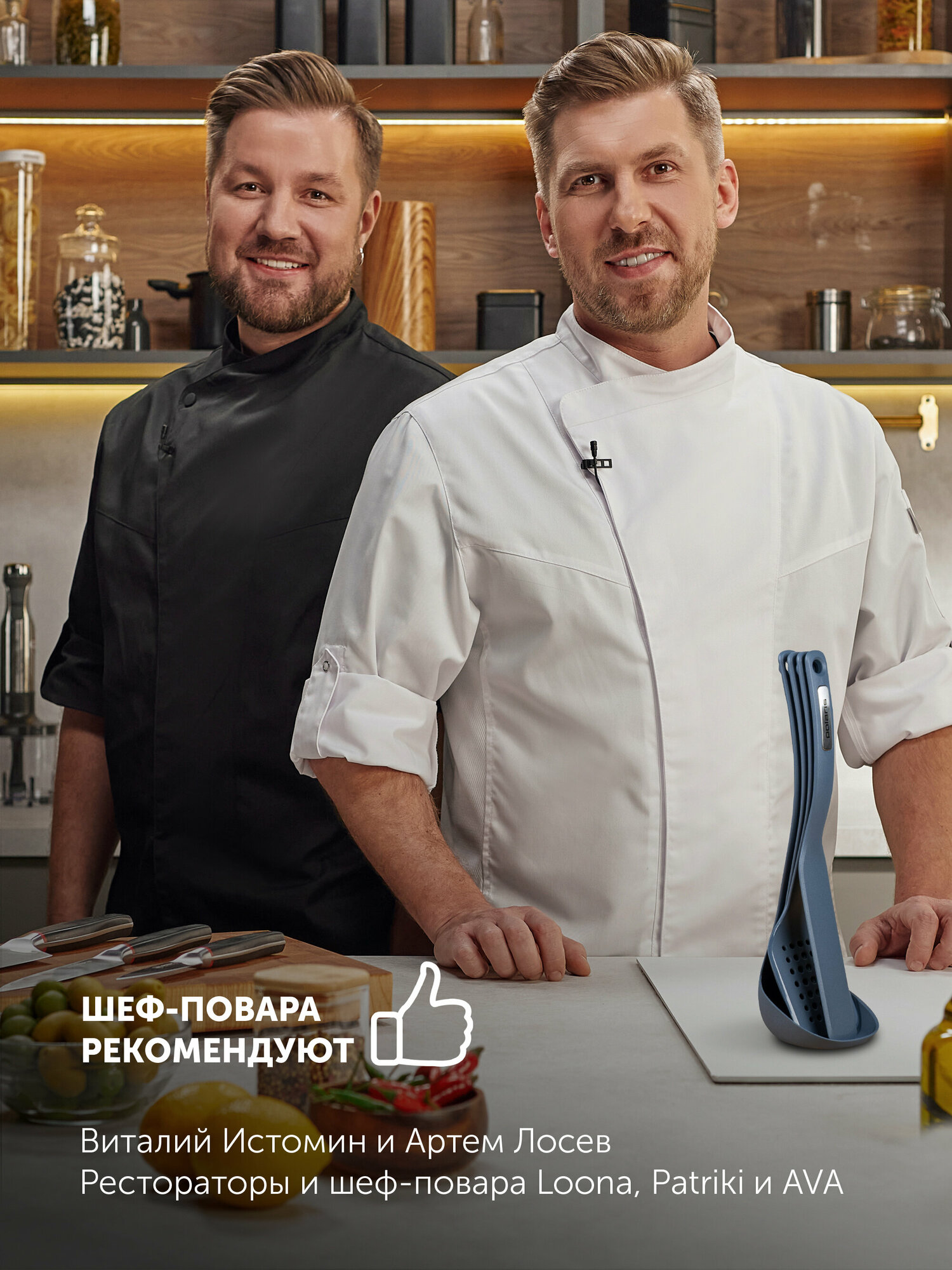 Пользуемся абсолютно всеми аксессуарами, на них предусмотрены небольшие отверстия так что мы подвесили прямо над столом для большего удобства. Качество нержавеющая сталь и нейлон, даже при варке на плите можно спокойно помешать, принадлежности выдерживают большую температуру.