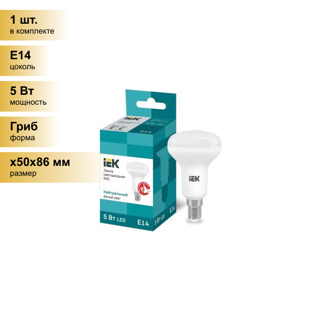 Лампочка Светодиодная IEK Гриб 5Вт 230В E14 R50 450Лм 4000К LLE-R50-5-230-40-E14, упаковка 1шт.