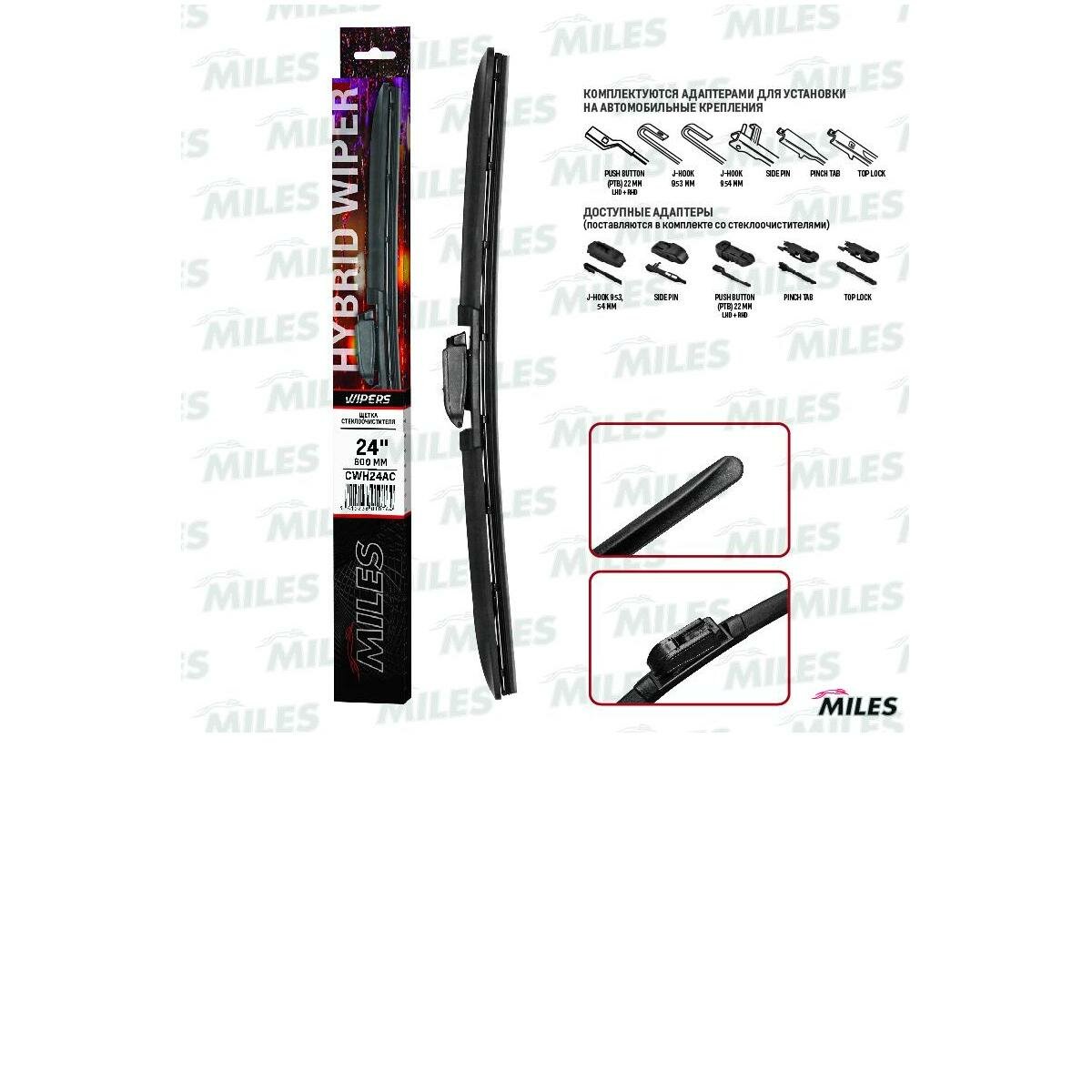 Щётка стеклоочистителя Miles CWH24AC гибридная Miles 24"/600mm "крючок" 9x3/9x4 + 3 адапт. side pin, push button, pinch tab Miles CWH24AC