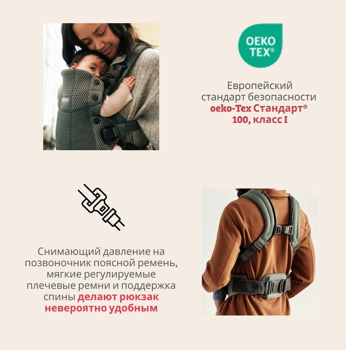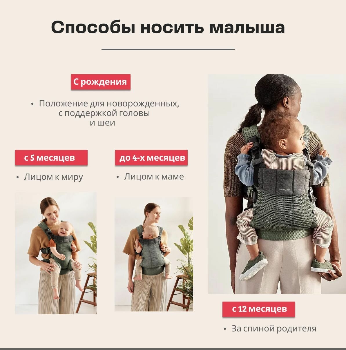 | Положение ребенка | сидя лицом к родителю / сидя спиной к родителю / за спиной родителя |