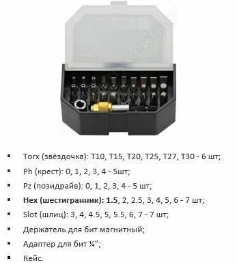 | Биты подробно | 1/4": T10, T15, T20, T25, T27, T30, PH0, PH1, PH2, PH3, PH4, PZ0, PZ1, PZ2, PZ3, PZ4, H1.5, H2, H2.5, H3, H4, H5, H6, SL3, SL4, SL4.5, SL5, SL5.5, SL6, SL7 |