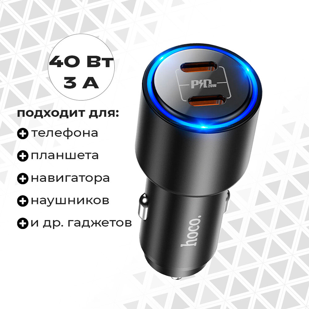 Автомобильное зарядное устройство для телефона, планшета в прикуриватель Hoco, разъемы 2xUSB Type-C, быстрое PD 40W, черное, для iPhone, Android