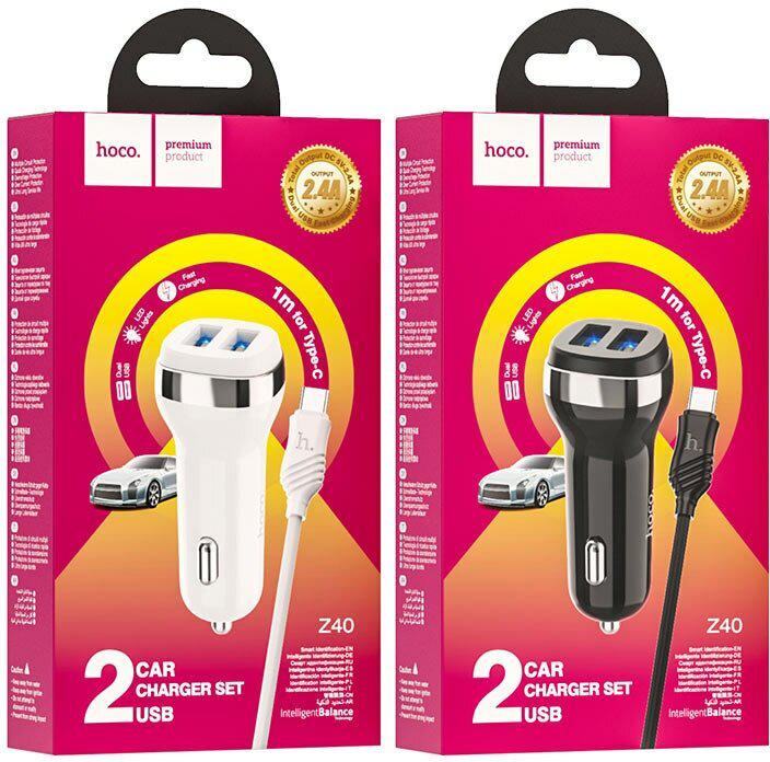 Автомобильное зарядное устройство (АЗУ) Hoco Z40 (2 USB) + кабель Type-C, 2.4 А, черный