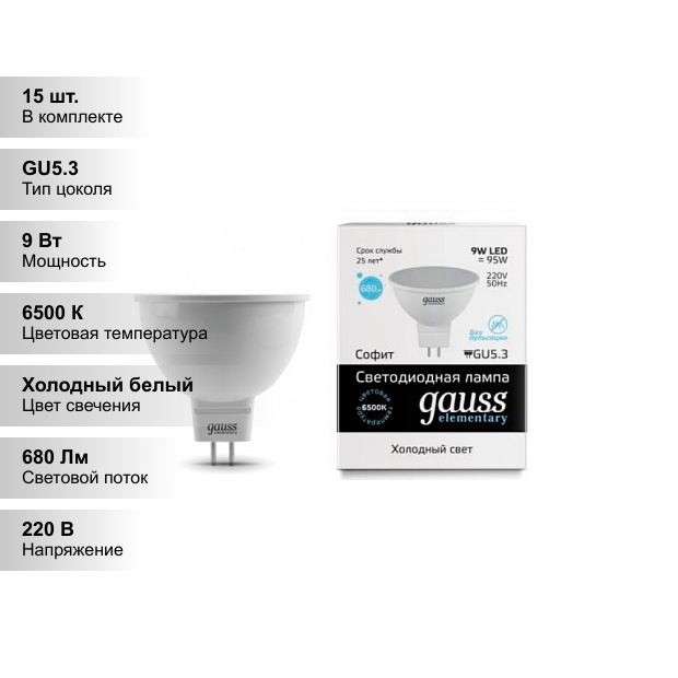Лампочка светодиодная MR16 GU5.3 9W холодный белый свет 6500K упаковка 10 шт. Gauss Elementary