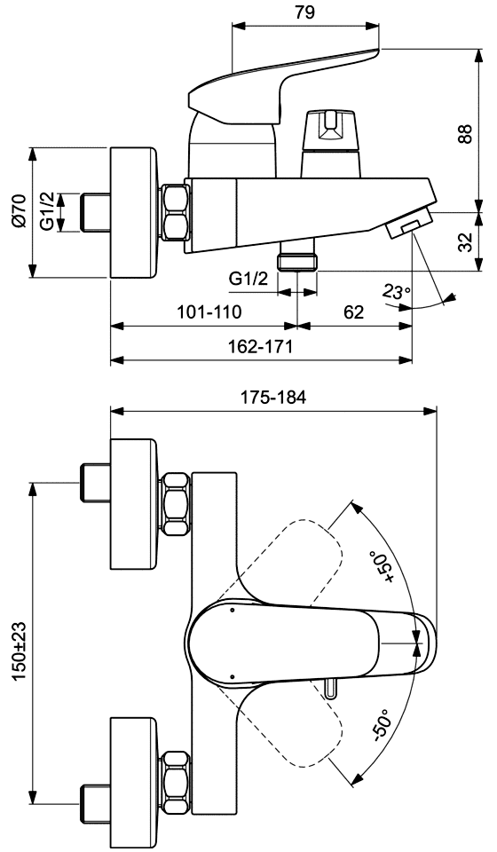 Смеситель для ванны/душа настенный, с керамич. переключателем, Ideal Standard CeraFlex B1740AA