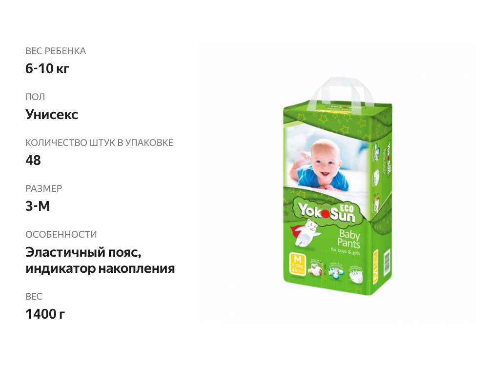 Купить Детские подгузники-трусики YokoSun Eco, размер 3/М (6-10 кг), 48 шт.