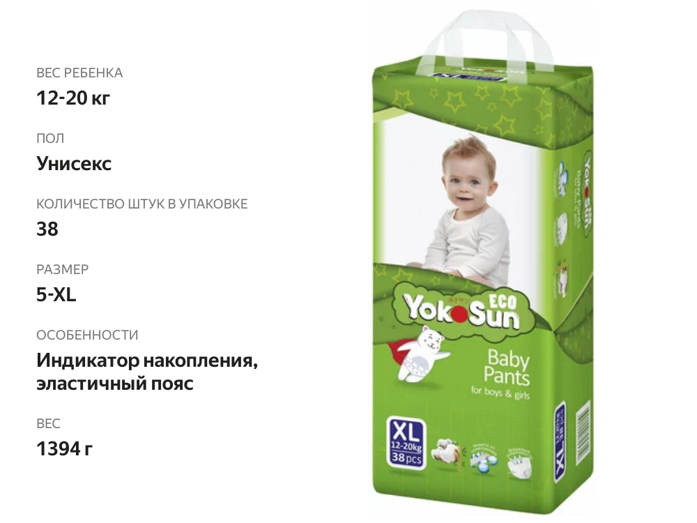 Купить Детские подгузники-трусики YokoSun Eco, размер 5/XL (12-20 кг), 38 шт.