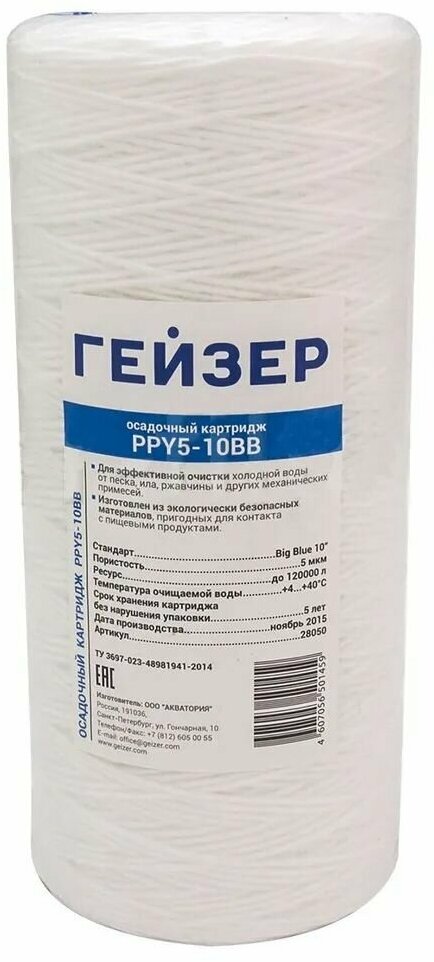 Полипропиленовый картридж механической очистки / полипропиленовая нить Гейзер PPY 5 для холодной воды - 10BB, 28050 - 1 шт.