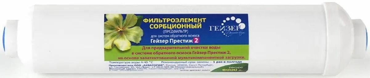 | Дополнительная информация | применяется для предварительной очистки воды в компактных обратноосматических системах Гейзер Престиж 2; не комплектуется фитингами |