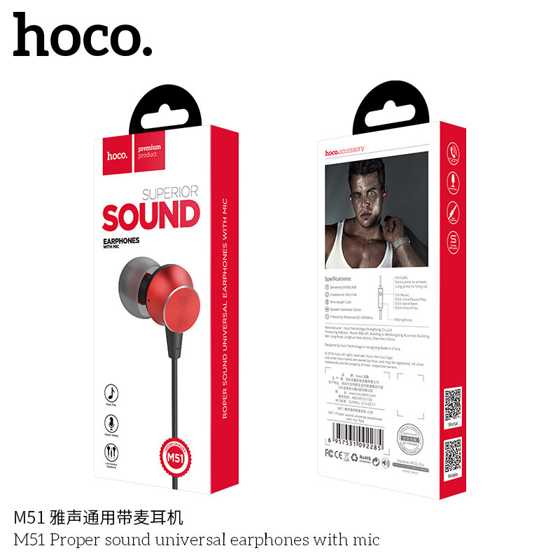 Наушники M51 Proper sound Universal Earphone, HOCO, вакуумные с микрофоном, красные