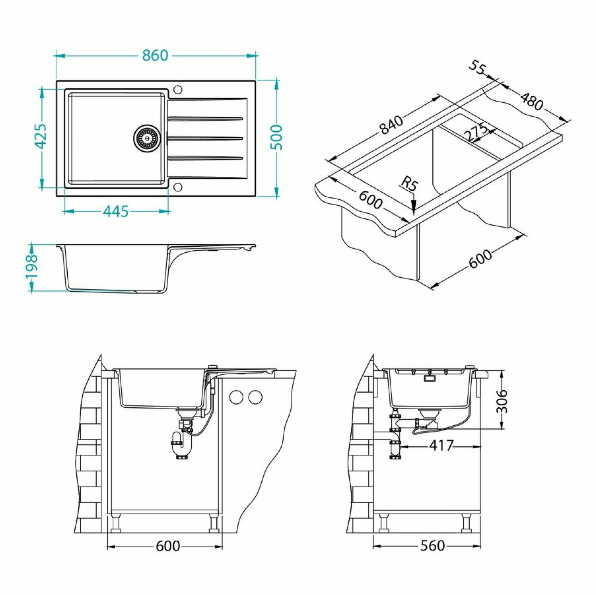 Мойка ALVEUS GRANITAL CADIT 40 CARBON - G91 860 X 500 1X в комплекте с сифоном 1132823,