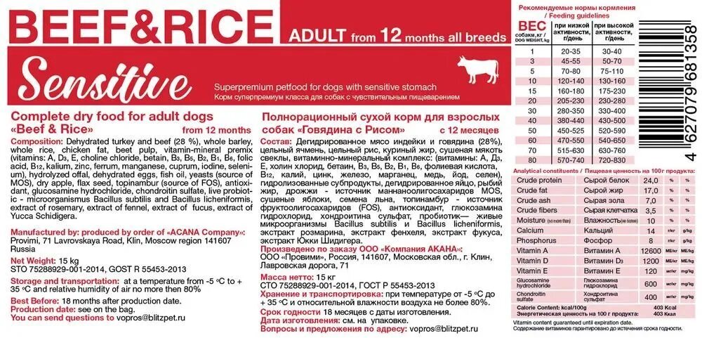 Сухой корм для собак Blitz при чувствительном пищеварении, говядина, с рисом 15 кг