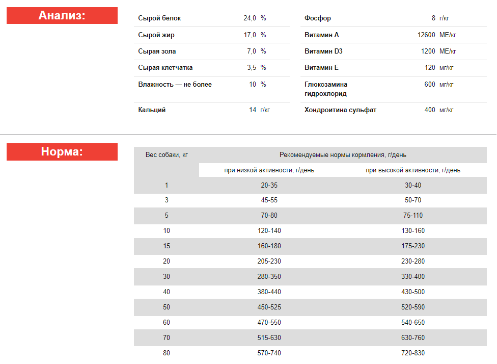 | Минеральные вещества | кальций - 14 г/кг, фосфор - 8 г/кг, глюкозамина гидрохлорид - 600 мг/кг, хондроитина сульфат - 400 мг/кг |