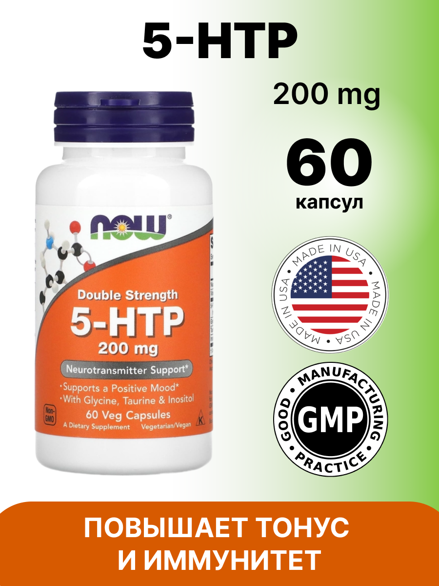 NOW Foods 5-HTP 200 mg - 5-гидрокситриптофан, двойной концентрации 60 вегетарианских капсул