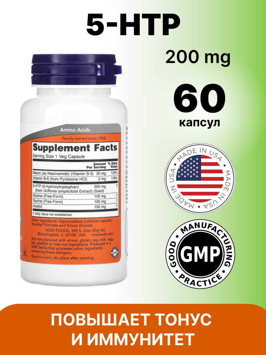 5-HTP NOW Foods, 5-ГидроксиТриптофан 200 мг + Глицин, Таурин, Инозитол - 60 капсул