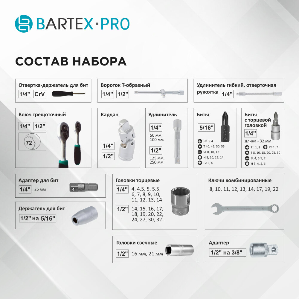 Набор слесарных инструментов Bartex, 1/2", 1/4", CrV сталь, кейс, 82 пр, шт