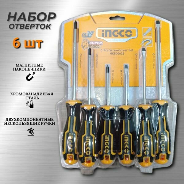 Набор отверток с магнитным наконечником 6 шт INGCO (HKSD0628)