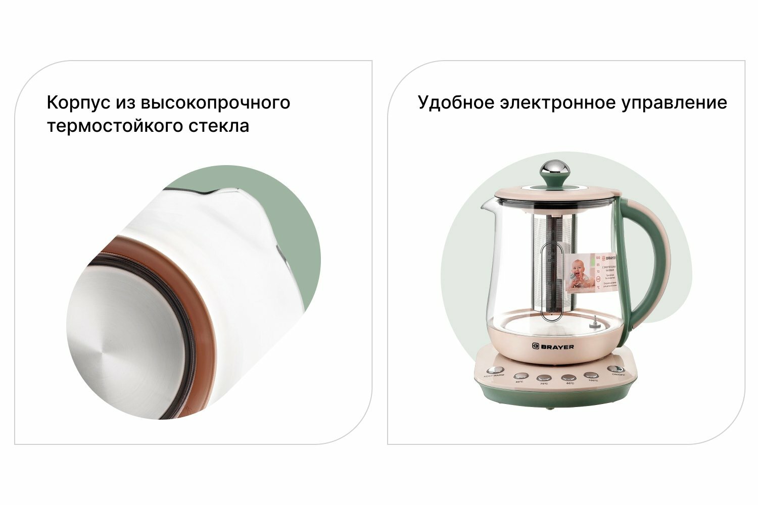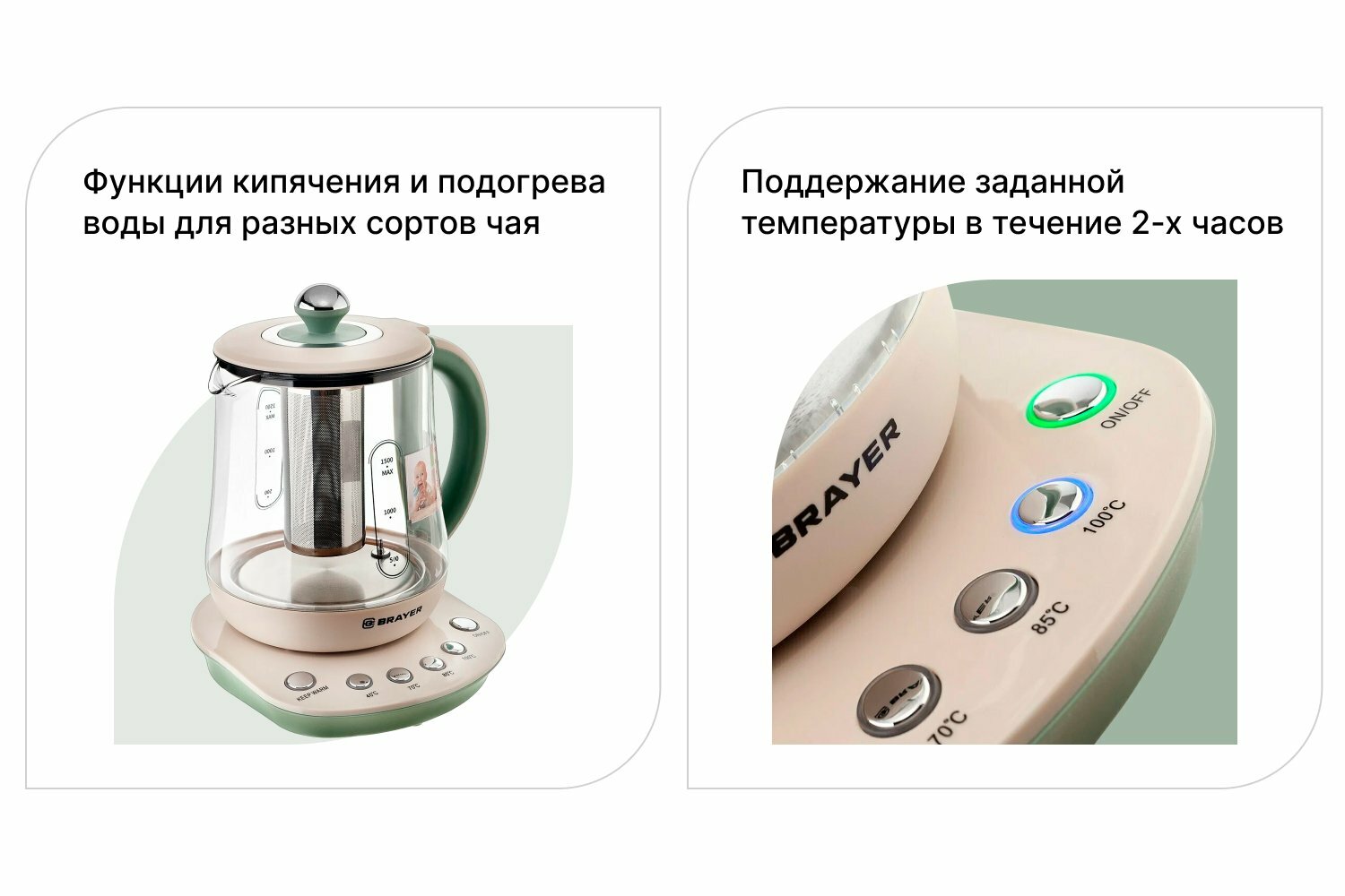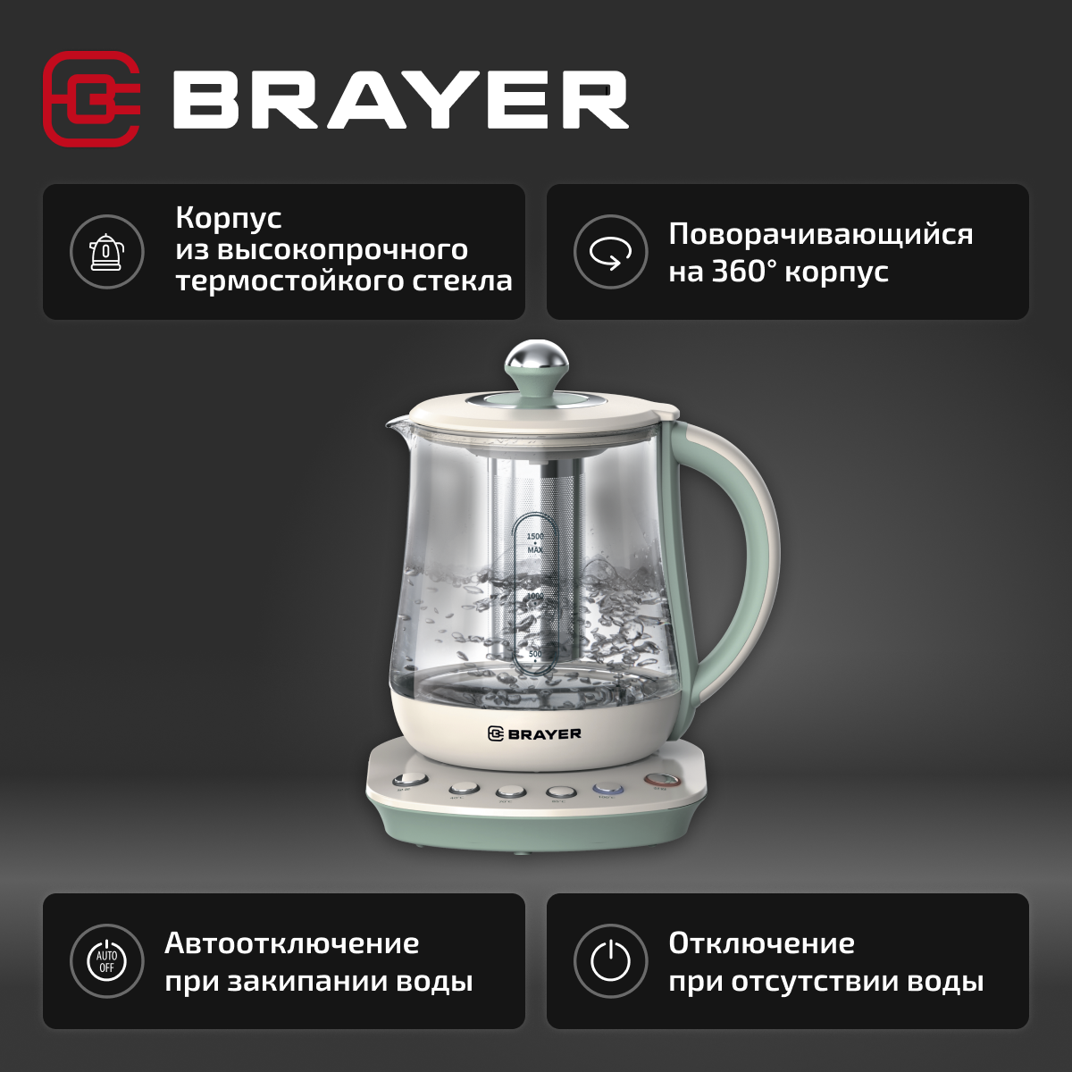 Электрический чайник BRAYER BR1015 2200 Вт, 1,5 л, подставка, подогрев 40-100 °С, заваривание чая, стекло