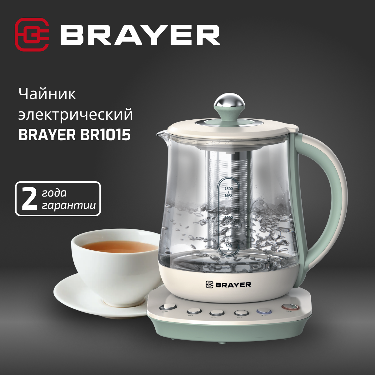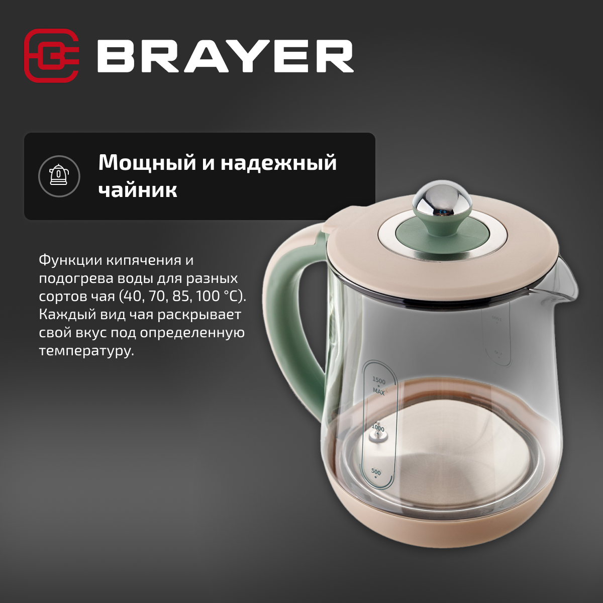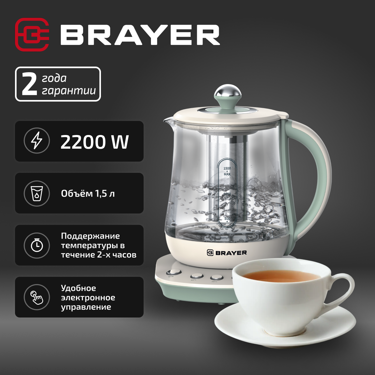Чайник Brayer 1015BR 2200 Вт, 1,5 л,завар.чая,поддер. и выбор t, стекло