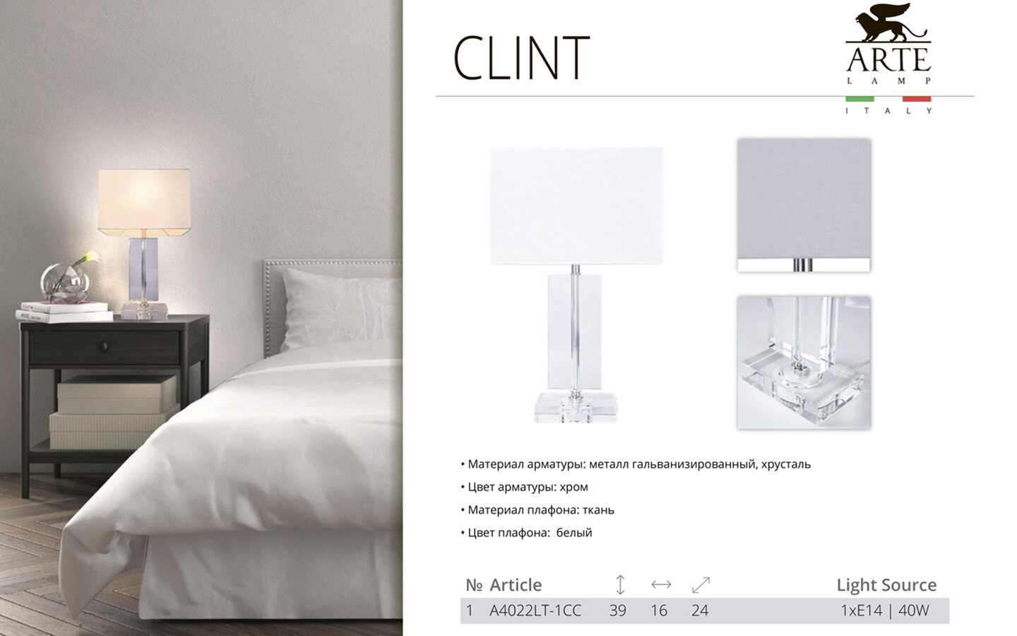 Настольная лампа ArteLamp CLINT A4022LT-1CC, E14, 40 Вт, металл, ткань, хрусталь, хром