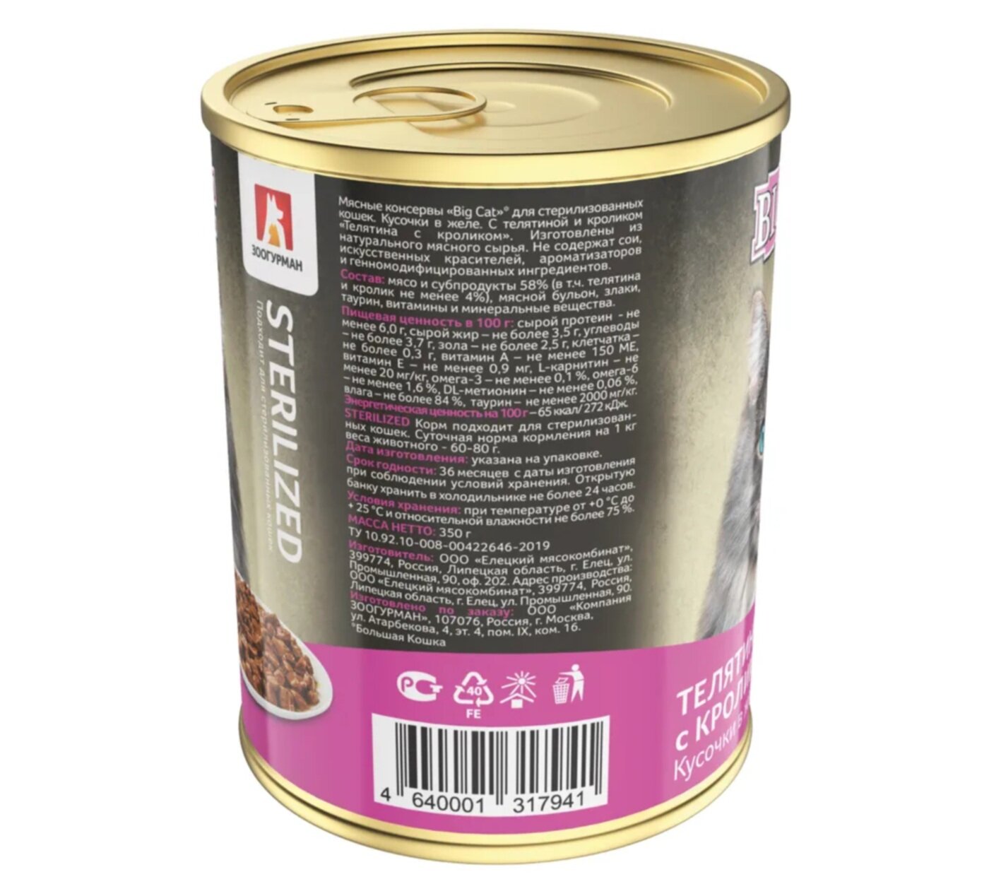 Ниже Вы можете прочитать отзывы на Зоогурман BIG CAT STERILIZED для взрослых кастрированных котов и стерилизованных кошек с телятиной и кроликом в желе (350 гр), ознакомится с подробными характеристиками, посмотреть интересные обзоры и фотографии на Зоогурман BIG CAT STERILIZED для взрослых кастрированных котов и стерилизованных кошек с телятиной и кроликом в желе (350 гр).