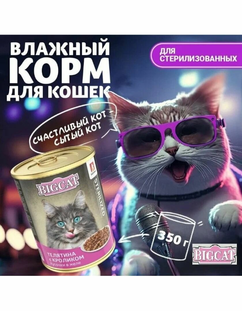 Корм влажный зоогурман BIG CAT Sterilized для кошек, кусочки в желе телятиной и кроликом 12шт.*350г