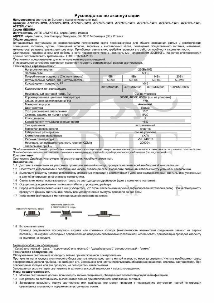 Типы/Светильники/Встраиваемые Arte Lamp Встраиваемый светодиодный светильник Arte Lamp Mesura A7978PL-1WH