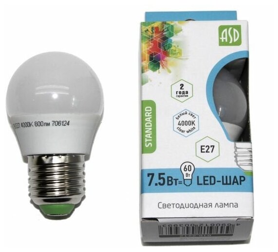 Лампа светодиодная ASD LED-ШАР-STD, E27, P45, 7.5 Вт, 4000 К