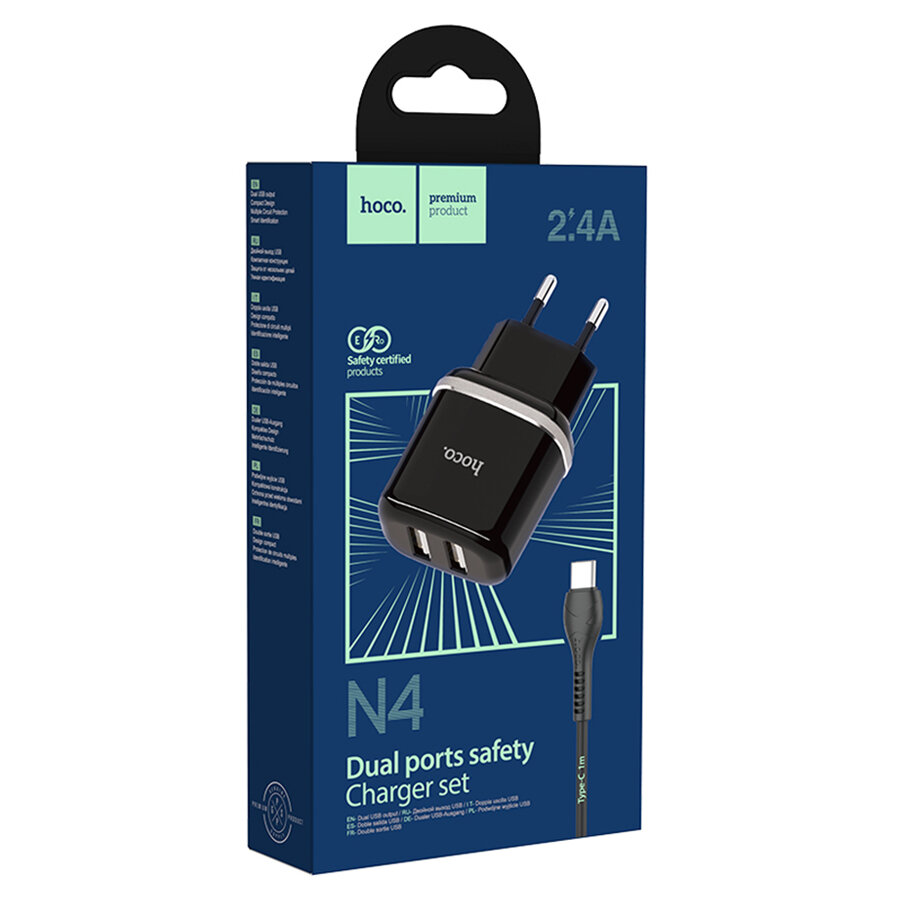 Сетевое ЗУ HOCO N4, 2хUSB-А, 2.4А + кабель (AM-Type-C), 1 м, черный (12/120)