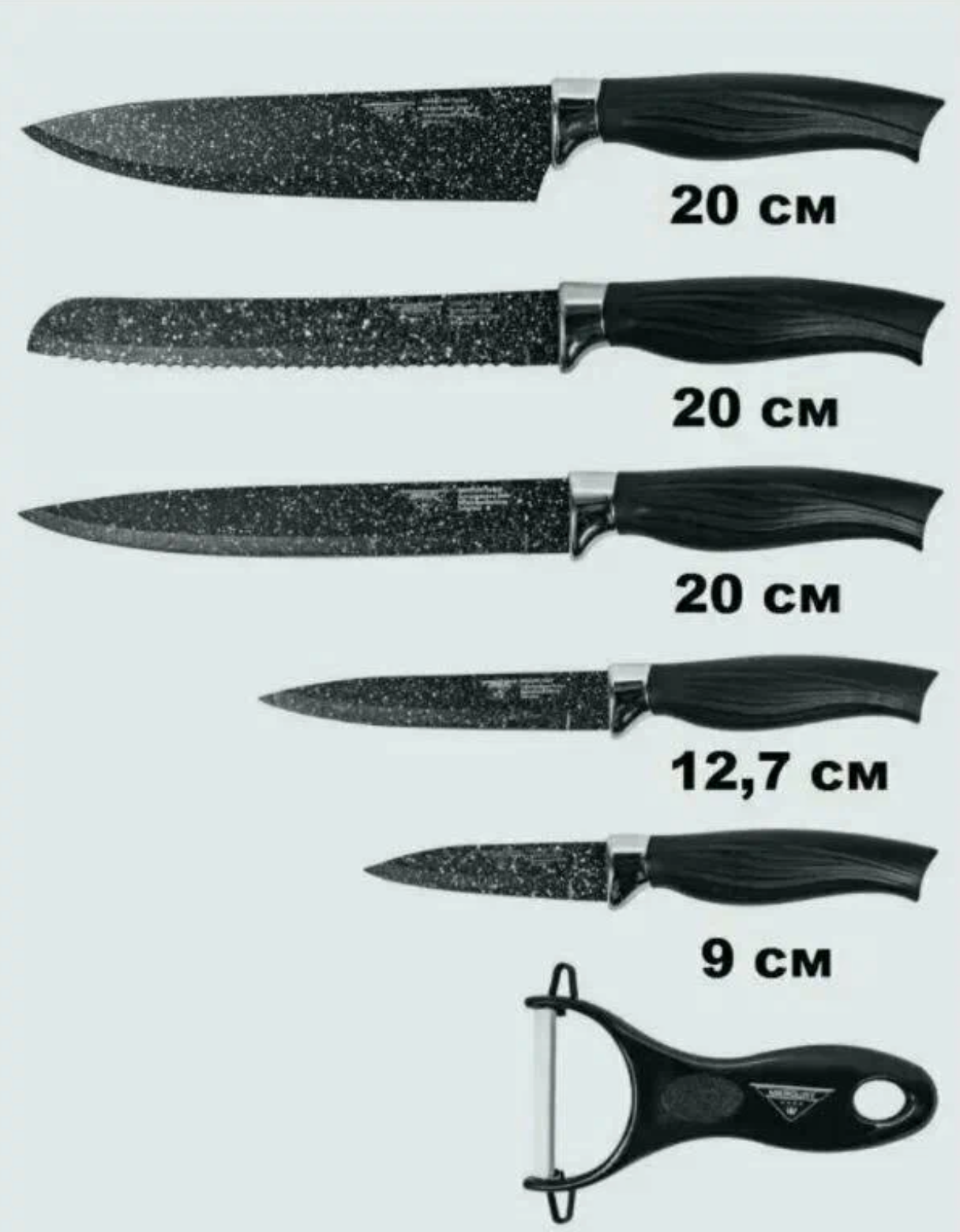 | Комплектация | Нож: поворской-1, для хлеба-1, для нарезки-1, универсальный - 1, овощной-1, овощечистка- 1. |