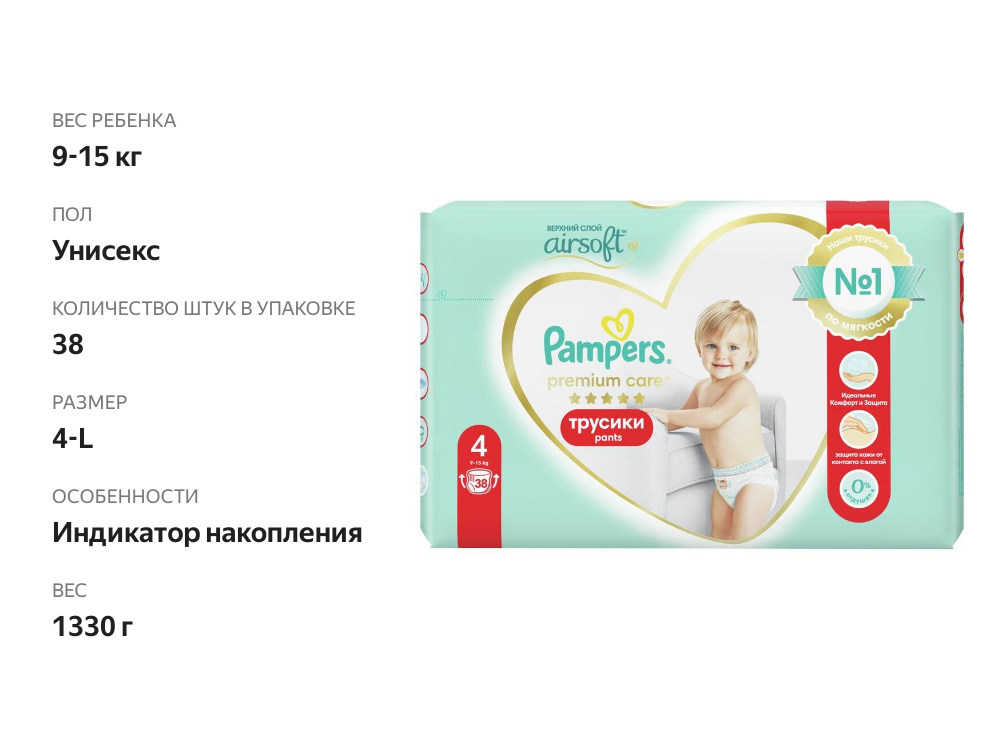 Подгузники-трусики Pampers Premium Care 9-15 кг, размер 4, 38шт.