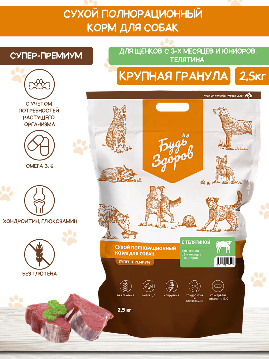 Будь ЗДОРОВ_ЖИВАЯ сила Корм для щенков с 3-х месяцев и юниоров c телятиной, Крупная гранула (2,5 кг)