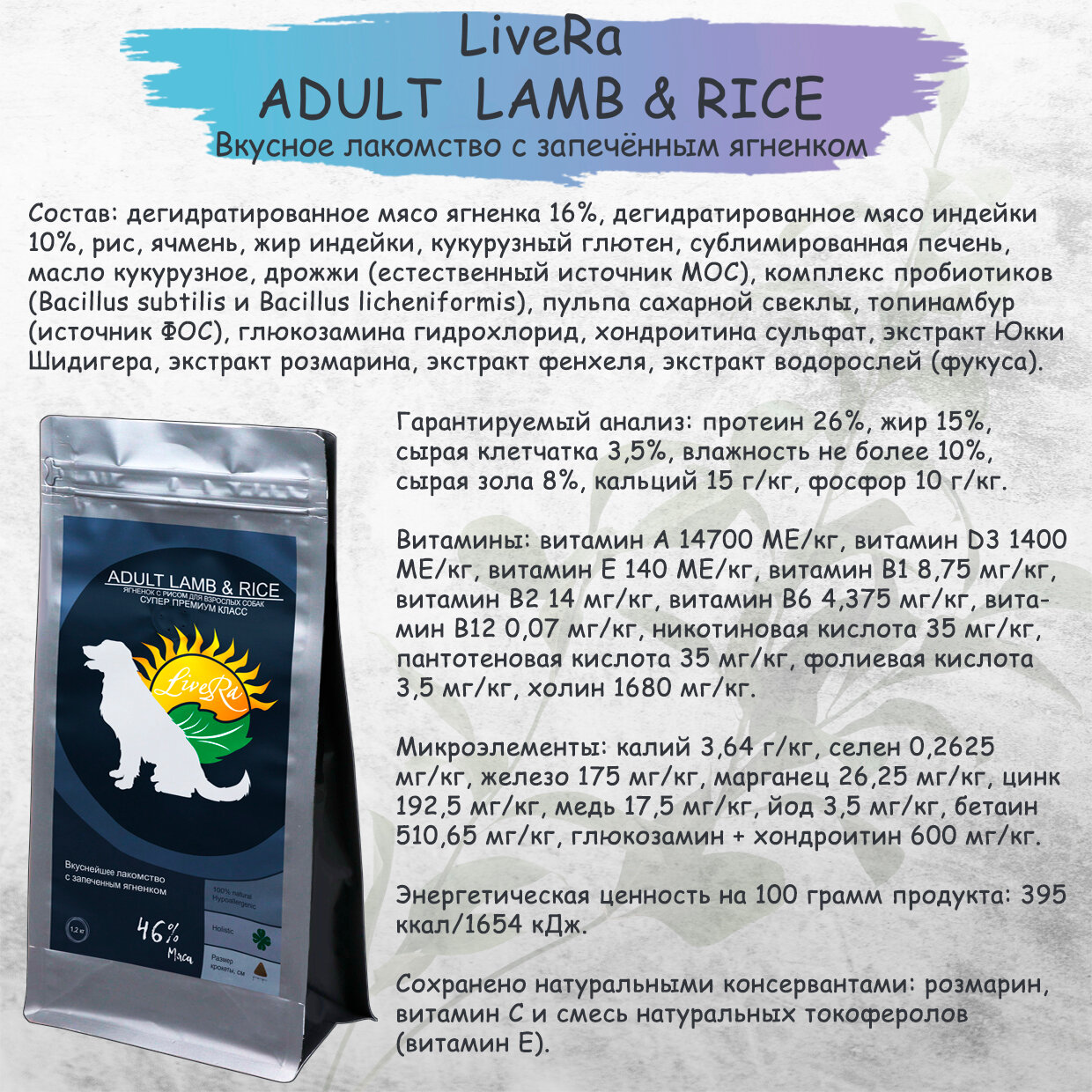 LiveRa Полнорационный сухой корм для взрослых собак Lamb & Rice, 1,2 кг - вкус ягнёнок с рисом