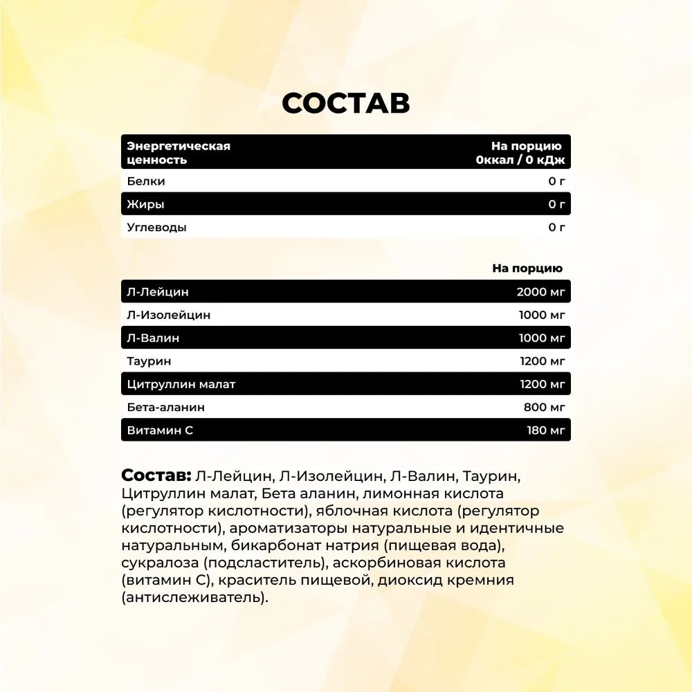 | Тип | аминокислотный комплекс / BCAA: валин / изолейцин / лейцин / таурин / цитруллин |