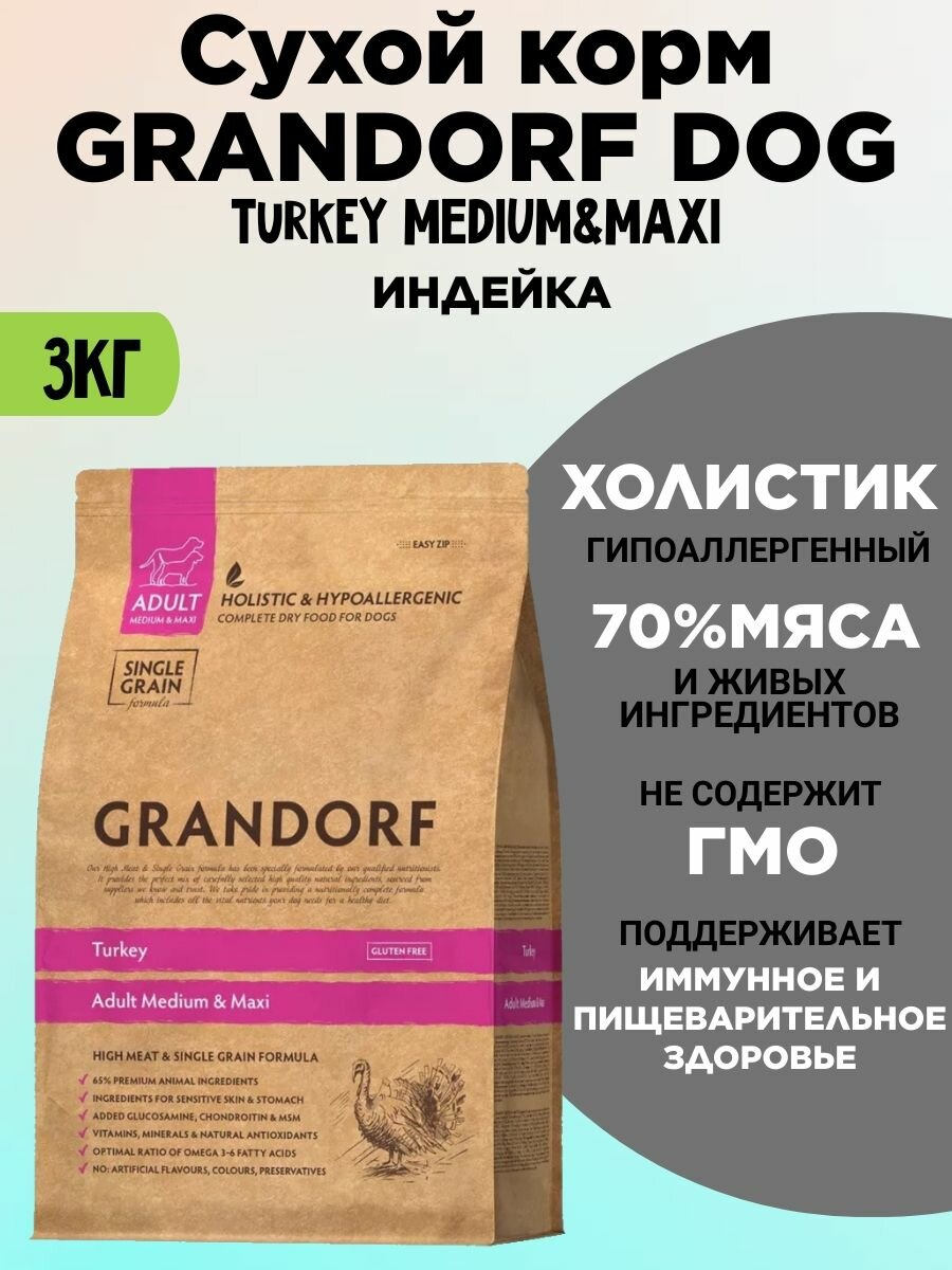 Сухой корм для собак GRANDORF Turkey Adult Medium Maxi 3 кг, индейка для взрослых средних и крупных пород от 1 года