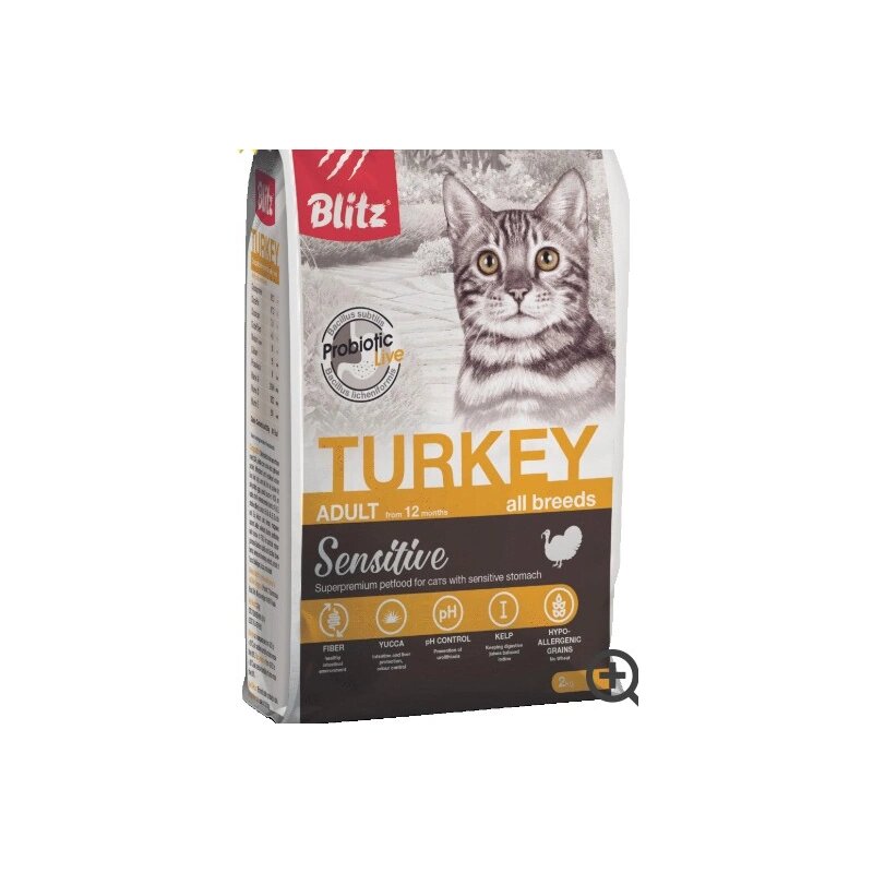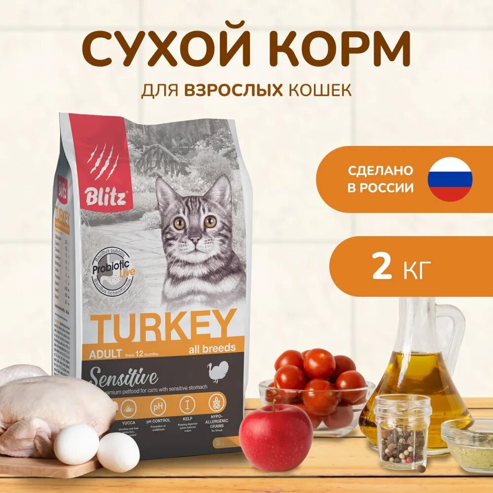 Сухой корм Blitz для кошек с чувствительным пищеварением индейка sensitive turkey adult cat all breeds 2кг 680269