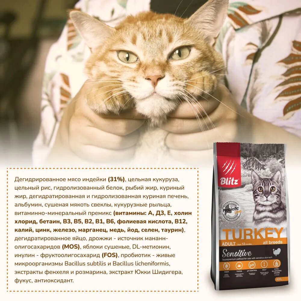 Корм для кошек сухой Blitz / Блиц Sensitive для взрослых животных, гранулы с индейкой 400г / кошачья еда для ежедневного кормления