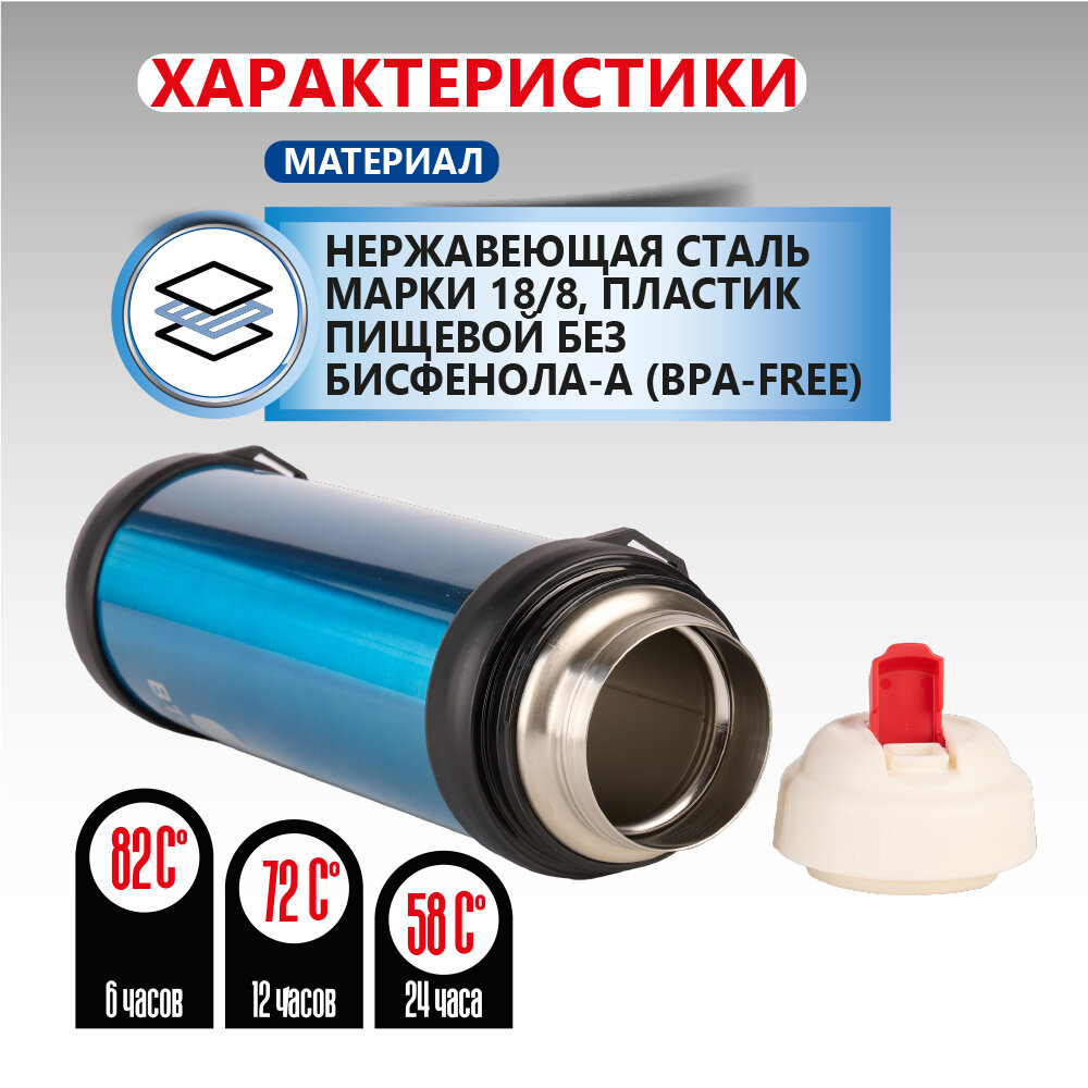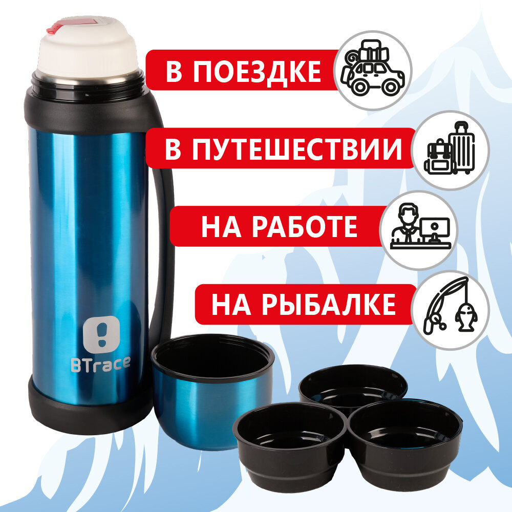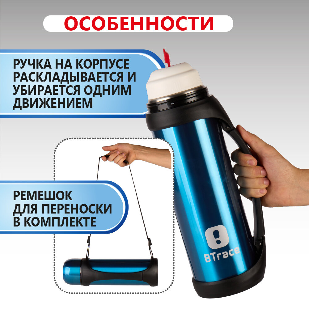 Термос для напитков Btrace 2,2 л, двойные стенки, синий, нержавеющая сталь, крышка-чашка, непроливайка, ручка для переноски интересное: