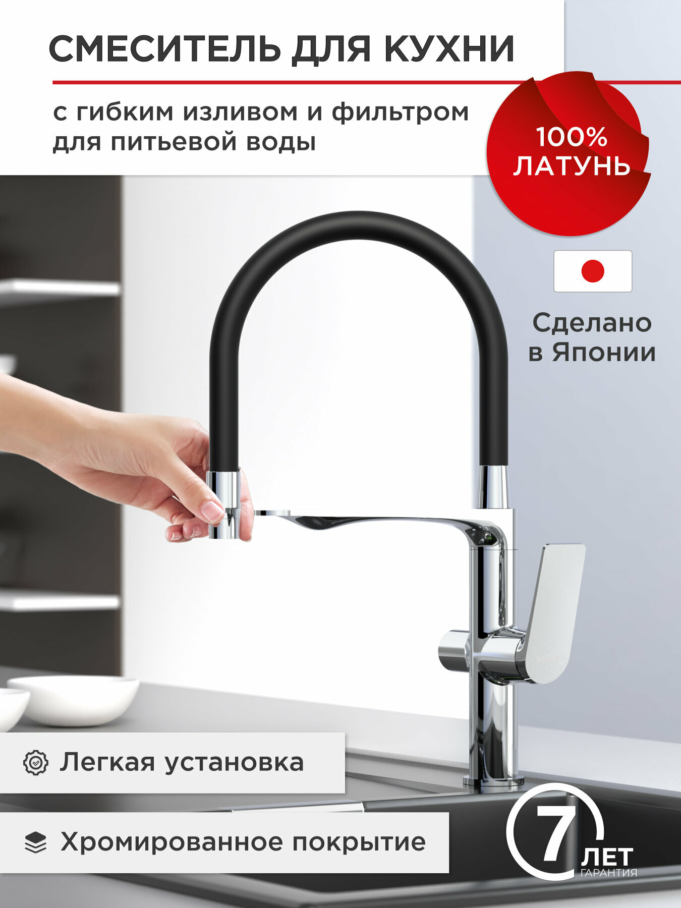 Кухонный смеситель для раковины с гибким изливом и фильтром для питьевой воды TOKITO TOK-MIT-1012 серия MITSUISHI, латунный, хром/черный