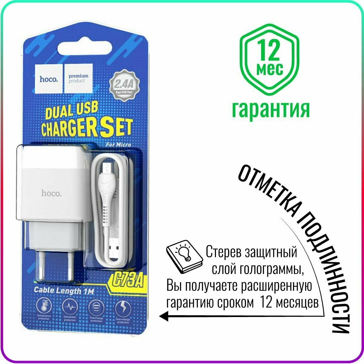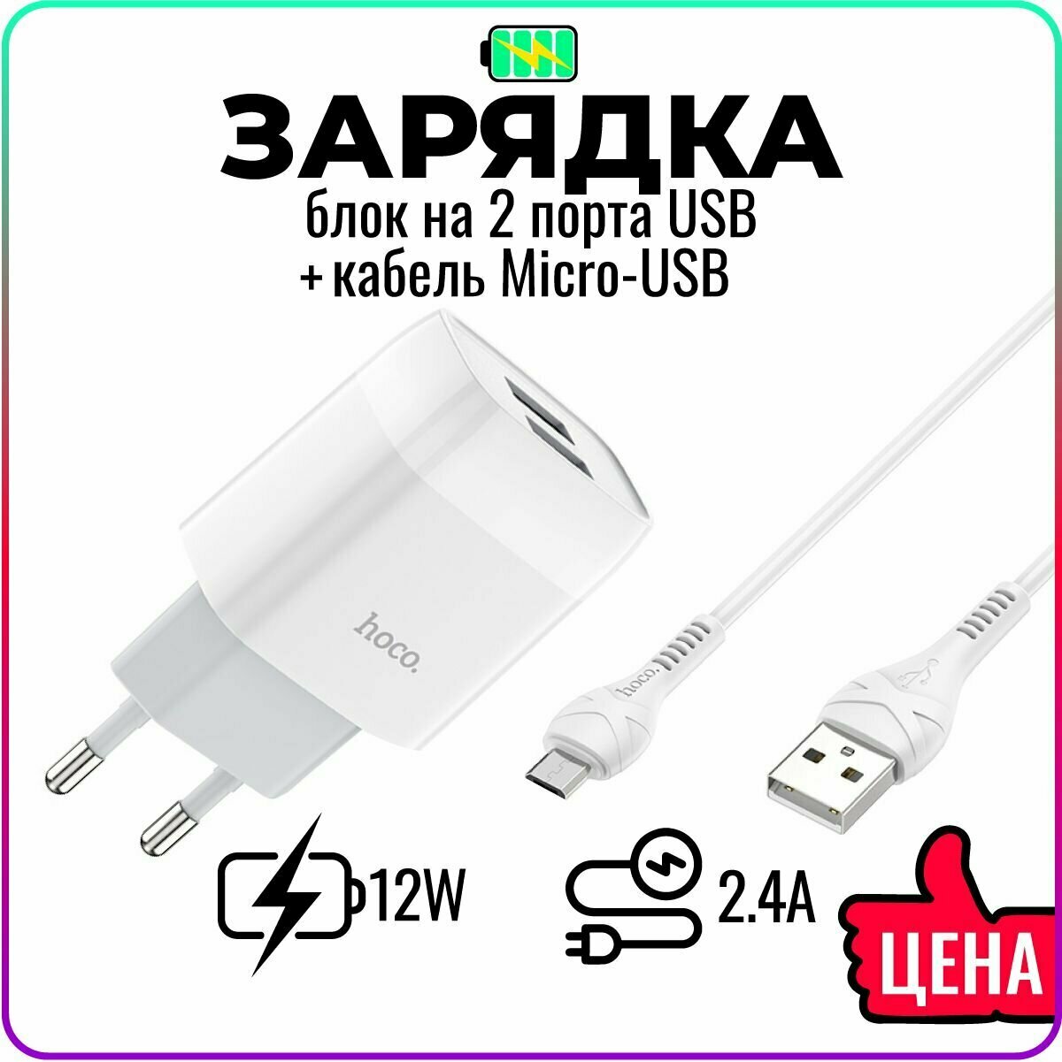 СохранитьСетевое зарядное устройство, 2 USB 2.4A (C73A), HOCO, Micro, белый интересное: