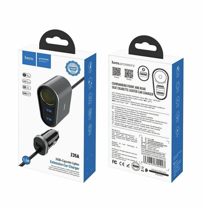 Автомобильная зарядка HOCO Z35A Companheiro, USB + разветвитель 2*USB+прикуриватель, 2.4A, 100 Вт, черный