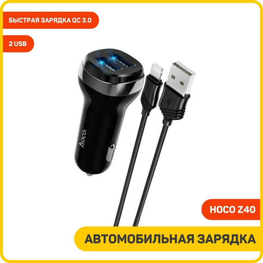 Автомобильное зарядное устройство (АЗУ) Hoco Z40 (2 USB) + кабель Lightning, 2.4 А, черный