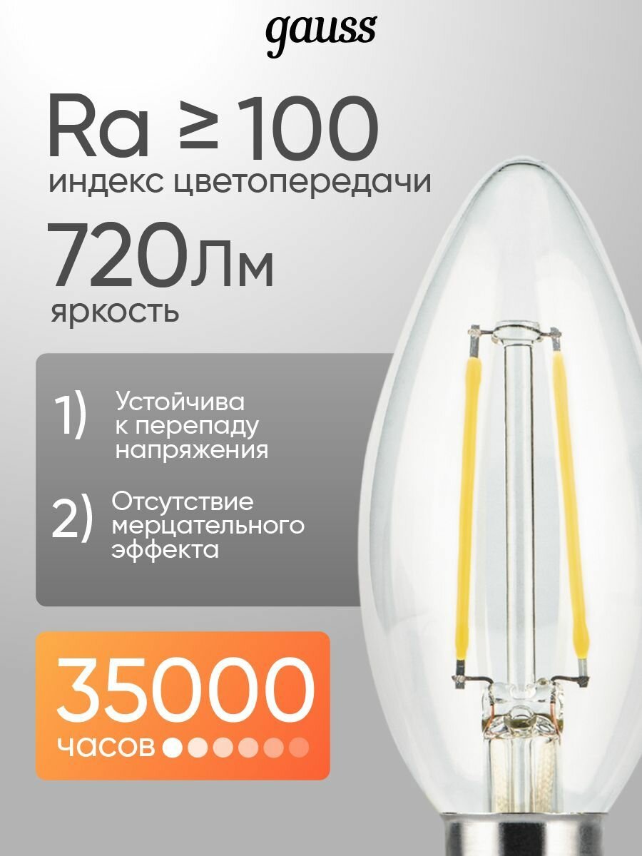 Лампочка Gauss Filament Свеча 11W=80W 810lm 2700К теплый свет Е27 светодиодная филаментная